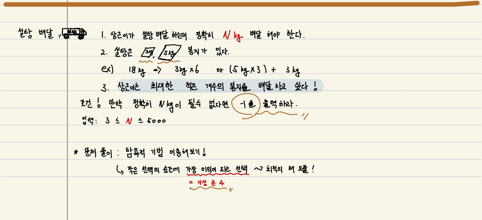 상근이는 요즘 설탕공장에서 설탕을 배달하고 있다. 상근이는 지금 사탕가게에 설탕을 정확하게 N킬로그램을 배달해야 한다. 설탕공장에서 만드는 설탕은 봉지에 담겨져 있다. 봉지는 3킬로그