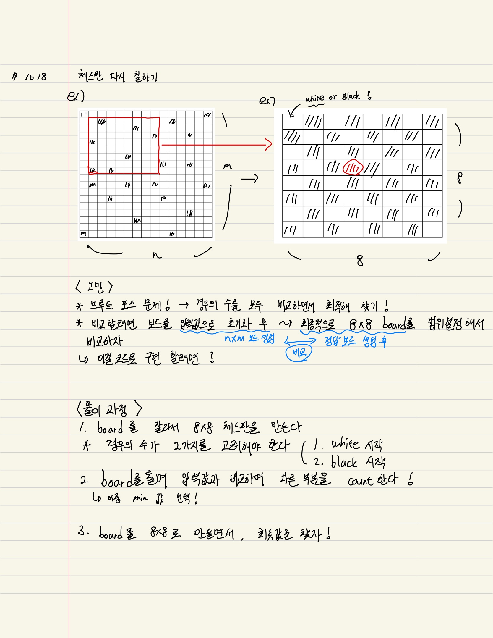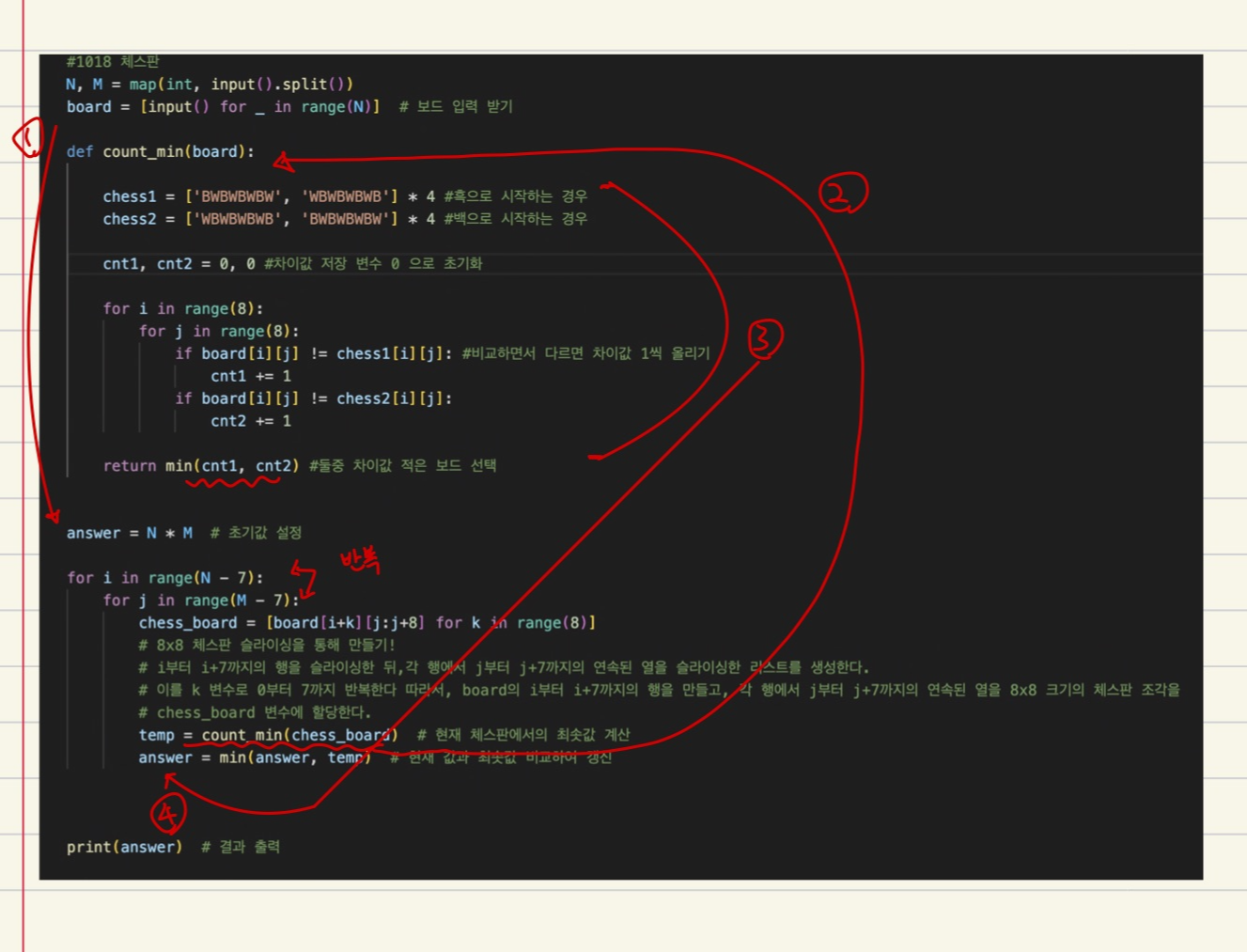 우선 정답 8x8 보드와 입력값으로 주어진 n x m보드의 흑백 위치를 비교하면서 다르면 카운트해줘서 값의 최솟값을 출력하면, 우리가 원하는 가장 적게 다시 칠해야 되는 경우의 수를 얻을 수 있다고 이해했다.
