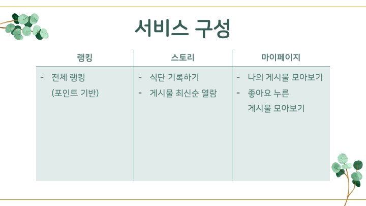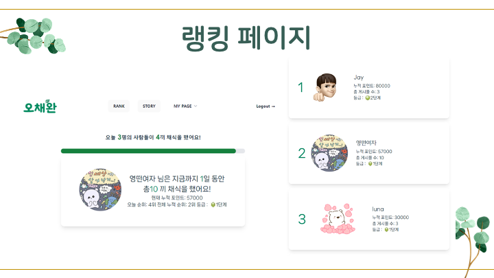 🌱 환경이라는 주제로 프로젝트 기획을 시작하였다. 실생활에서 많은 유저가 서비스를 이용하면서 환경에 기여하고, 나중에 확장성을 고려하고, 수익의 구조가 생길만한 서비스를 기획하고 싶었고, 결론적으로 채식을 통해 포인트를 얻고, 포인트를 사용할 수 있는 농가 쇼핑몰 기능 그리고 랭킹 기능이 있는 서비스를 기획하게 되었다.