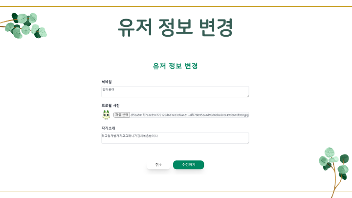 - 개인정보수정 기능: 닉네임, 프로필사진, 자기소개 수정 기능