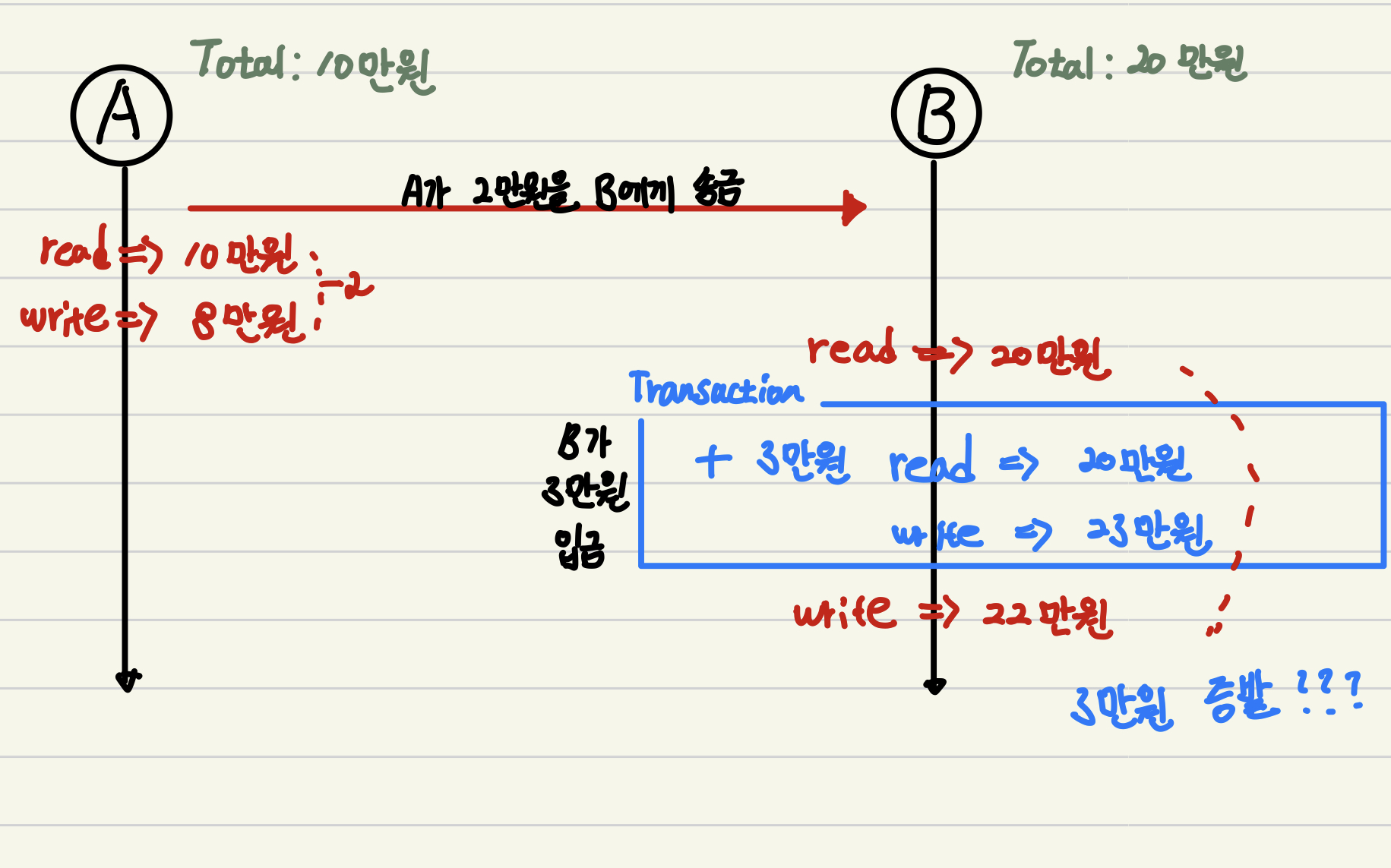 만약 아래와 같은 그림 예시에서, A가 2만 원을 B에게 이체하고(빨간색), 동시에 B도 자신의 계좌에 3만 원을 입금한다면?(파란색) 3만 원이 증발한다...