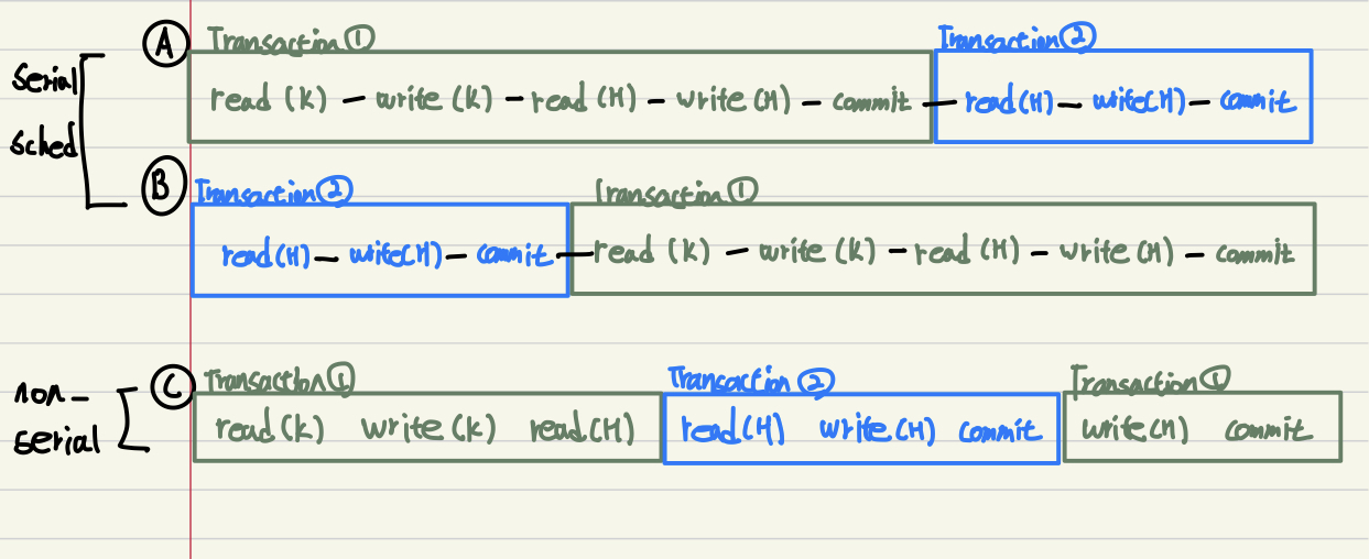 Serial schedule : transaction들이 겹치지 않고 한 번에 하나씩 실행되는 schedule
