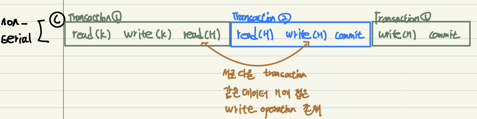 Non-serial schedule : transaction들이 겹쳐서 동시에 실행되는 schedule