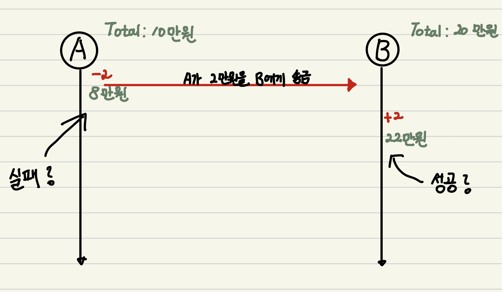 이와 같이 transaction을 이용한다면, 위와 같은 문제가 발생했을 시 B가 받은 2만 원의 쿼리가 성공하였어도, DB에 결과를 반영하지 않기 때문에, 문제가 발생하지 않는다.