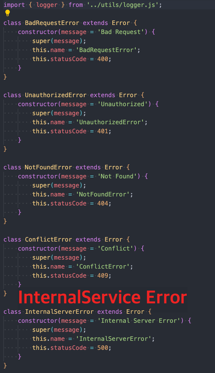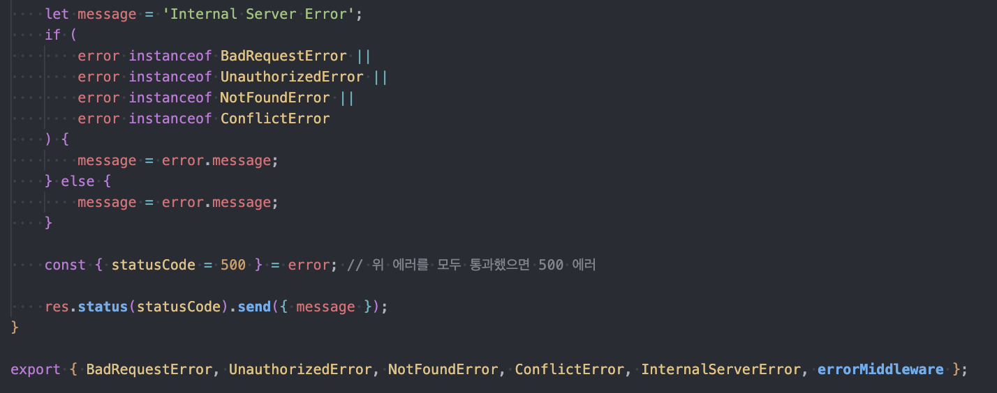 에러 핸들링은 반복적인 작업이고, 서로다른 엔드포인트와 기능이라 하더라도 동일한 에러를 뱉는 경우가 많은데, 이럴 때마다 새로운 에러를 생성해 주면 코드는 복잡하고 가독성이 떨어지며, 혹시라도 에러에 대해 수정을 한다면, 각각 따로 작성해 놓은 에러 코드마다 수정을 해주어야 하는 아찔한 상황이 펼쳐지며 유지보수가 어려워진다.(실제로 초반에 조금 매운 맛을 보았다 ㅎㅎ)