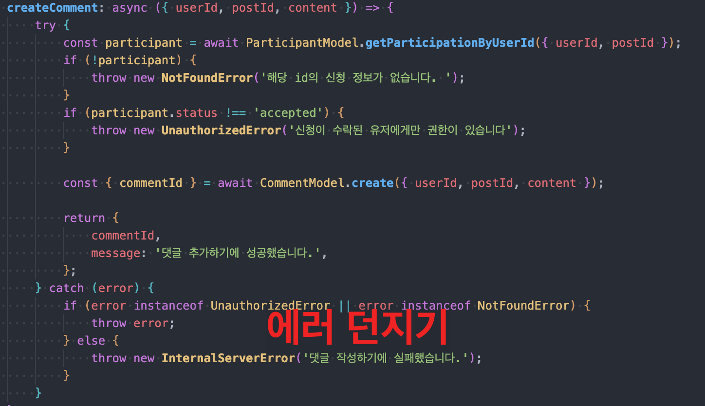 오채완 프로젝트를 진행할 때였다. 코드리뷰를 받는 과정에서 백엔드 코치님께서 아래와 같이 피가 되고 살이 되는 코칭을 해주셨고, 에러 핸들링이라는 개념을 접하게 되었다.