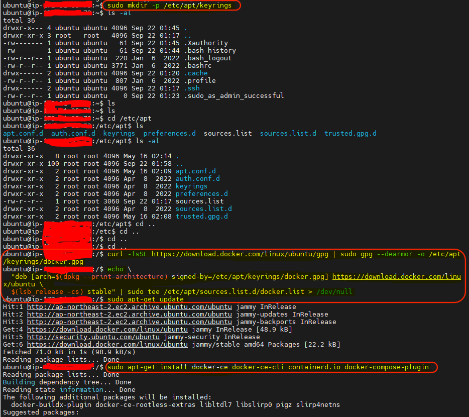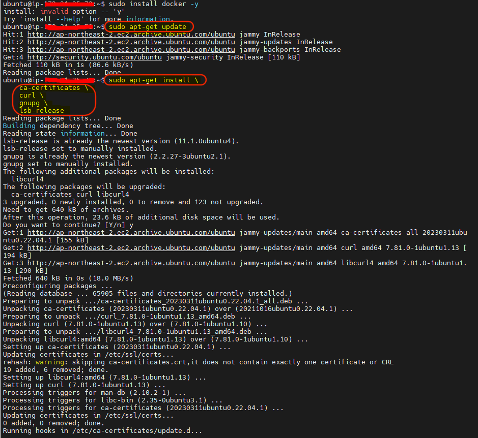 다시 한번, 레포지토리를 셋업 하기 위해 명령어를 통해 우분투의 apt 패키지의 인덱스를 최신화하고, HTTPS를 통해 패키지 설치가 가능하도록 설정한다.