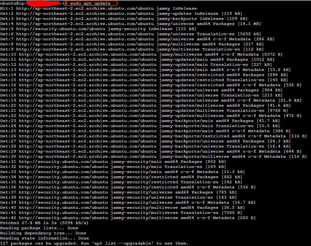 인스턴스에 접속해서 우분투 패키지 관리 툴 명령어인 apt update를 통해 레퍼지토리 인덱스 갱신을 통한 업데이트를 해주었다.