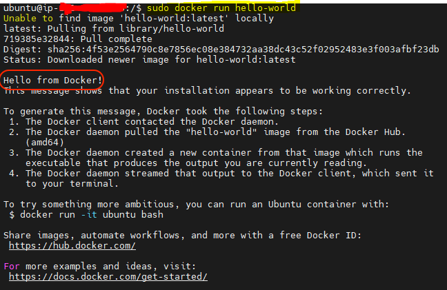 도커 공식문서에 나와있는 설명을 따라 GPC 키를 추가하고 도커 엔진을 다운로드해 주면, Hello from Docker!라는 문구와 함께 성공적으로 도커가 설치된 것을 확인할 수 있다.