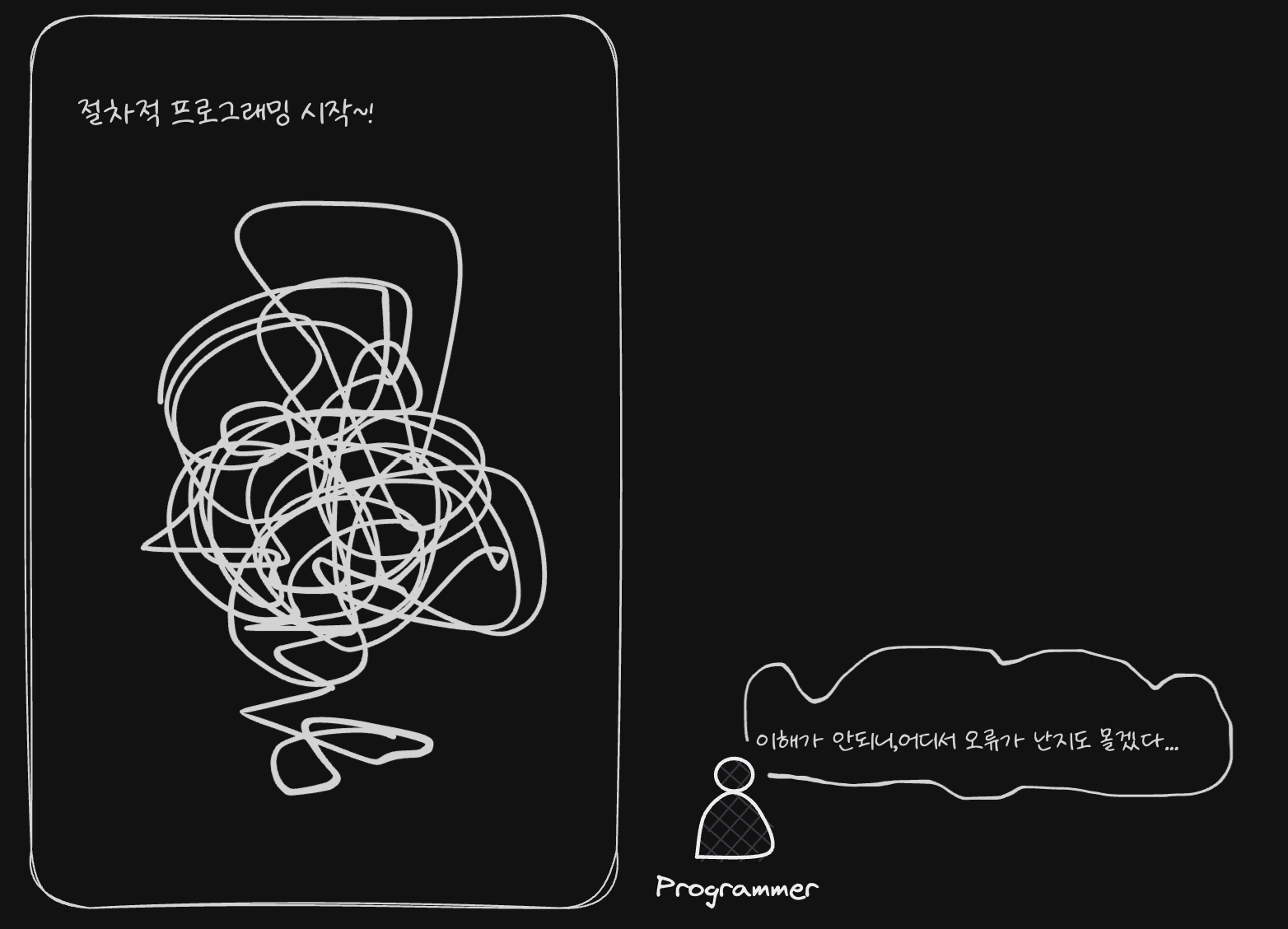 결론부터 말하면 사람을 위해서라고 이야기할 수 있을 것 같다. 과거에는 지금처럼 큰 규모의 소프트웨어와 하드웨어가 존재하지 않았고, 그에 따라 엄청~ 복잡한 절차적 프로그래밍이 나오는 경우가 많지 않았다고 한다. 그래서 사람이 코드를 읽고 이해하기 문제가 없다고 이야기한다. 벌써 뒤에 나올 이야기의 내용이 유추되지 않는가? 기술의 발전을 통해 소프트웨어는 또한 점점 복잡해지고 거대해졌고, 기존의 절차적 프로그래밍 방식으로 코딩을 하다 보니, 흐름을 이해하기도 쉽지 않고 유지보수는 더욱더 힘든 일명 "스파게티 코드"가 발생하니, 다른 방식의 해법이 절실했던 것이다. 실행은 컴퓨터가 하지만 결국 설계와 작성은 사람이 하는데 사람이 이해를 할 수 없는 코드를 짤 수 없지 않은가.