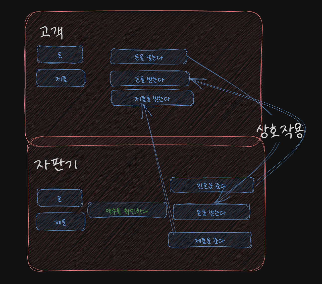 작은 단위의 독립적인 역할과 책임을 수행하는 객체(부품)가 모여 소통하면서,