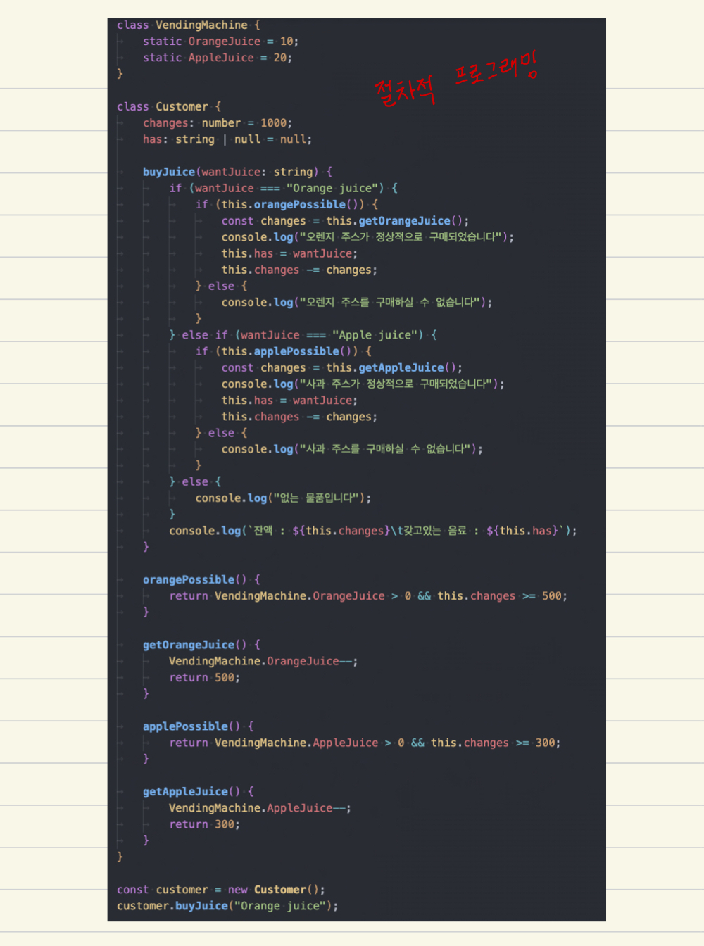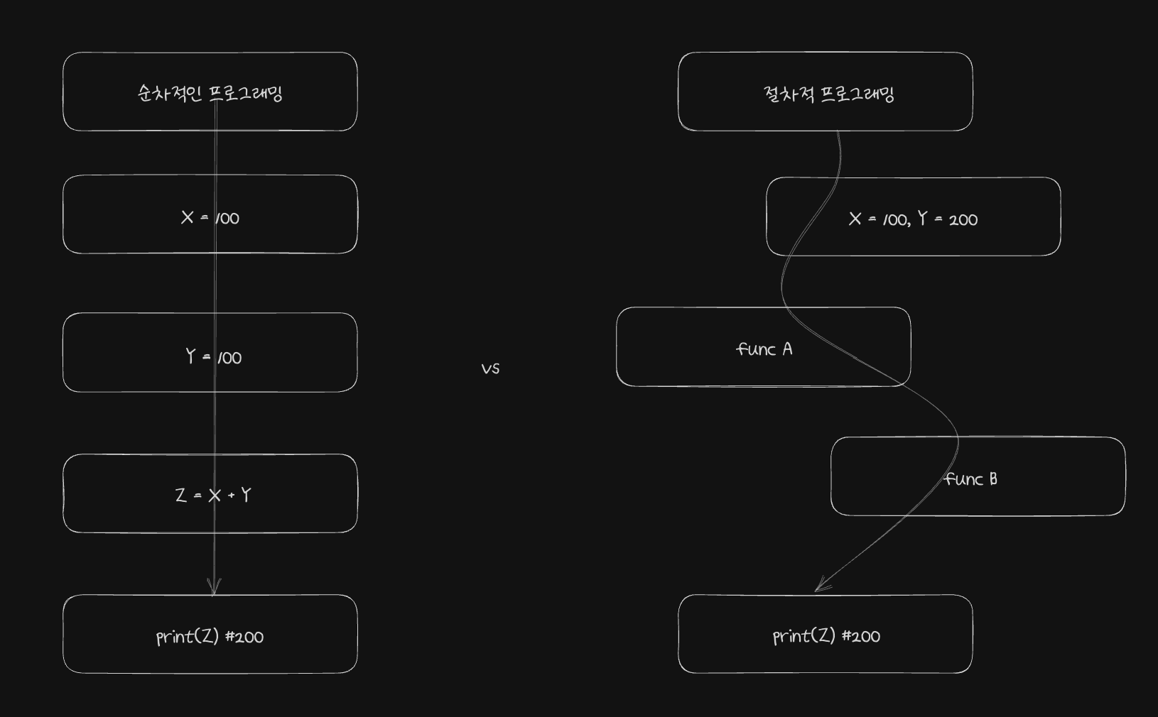 우선, 느낌으로만 보면 객체지향의 반대에 있는 것 같은 절차적 프로그래밍을 알아보자. 프로그래밍을 시작한 분들이라면 한 번쯤은 들어봤을 것이다.
