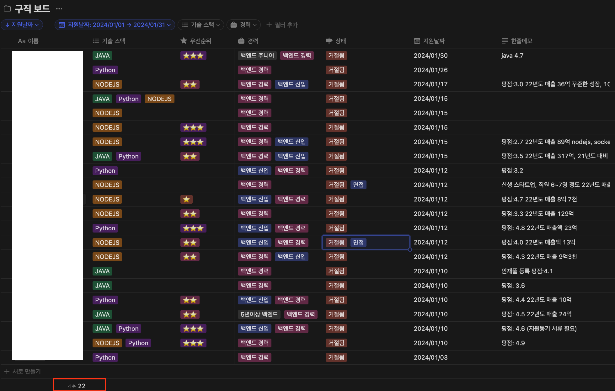 - 1월 총 22개의 지원서 접수 / 총 2개의 서류 합격 1차 면접